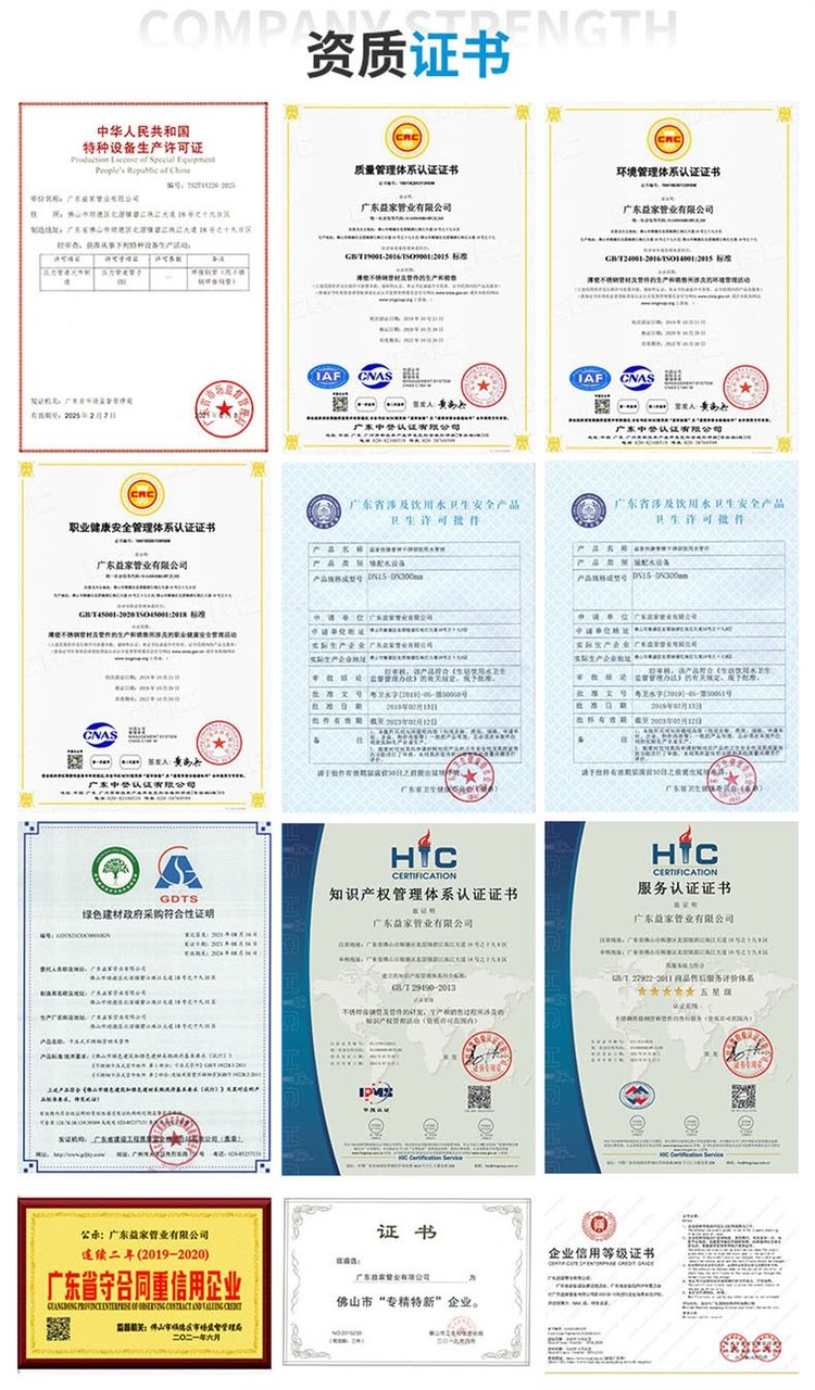 公司已通过涉水证产品卫生许可证(管材和管件)、ISO 9001:2015国际质量体系认证,所研发的多项产品获得了国家发明专利,产品质量稳定可靠,受到市场的极大欢迎和用户的一致好评。益家管业坚定企业宗旨将健康用水系统传播到千家万户,让健康随手可及。并始终秉承“生命源于健康,健康来自环保”的经营理念,努力向国际级饮用不锈钢水管制造企业的目标迈进。